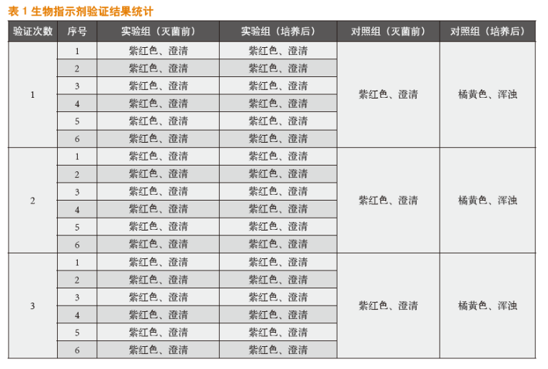 連續(xù)驗(yàn)證3次后,實(shí)驗(yàn)組安瓿的內(nèi)容物都呈紫紅色且澄清。實(shí)驗(yàn)結(jié)果見表1。